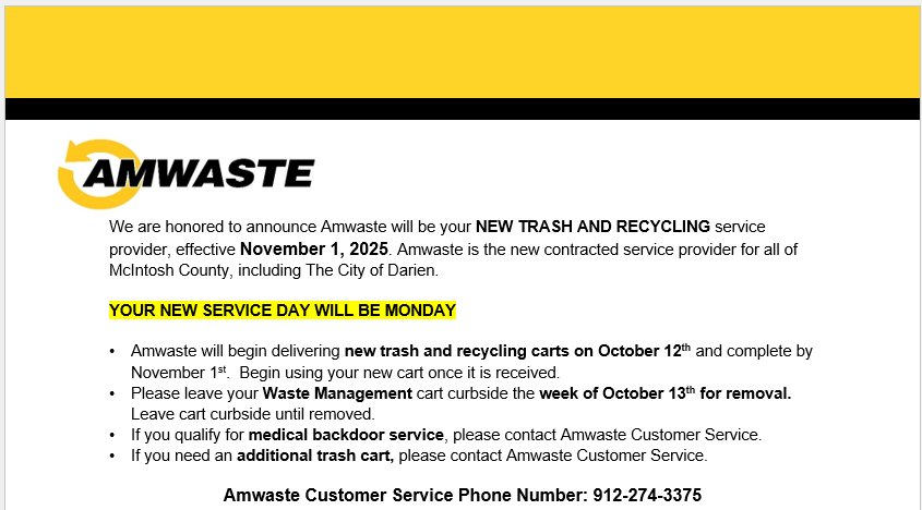 Regular home waste and recycling collection for McIntosh County is provided by Amwaste through McIntosh County. Effective November 1st, 2025.